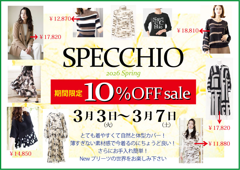 Jeanneberry&Rozen春コレクション Boutique 2026.03.02 SPPECCHO 特別企10%OFF エレガントなファッションを提供する[スペッチオ]。ハイクオリティな技術を活かしたシャトルプリーツは貴方をサイズの束縛から解放します。上質な装いをお楽しみ … (*SPECCHIO扱いショップの説明から)