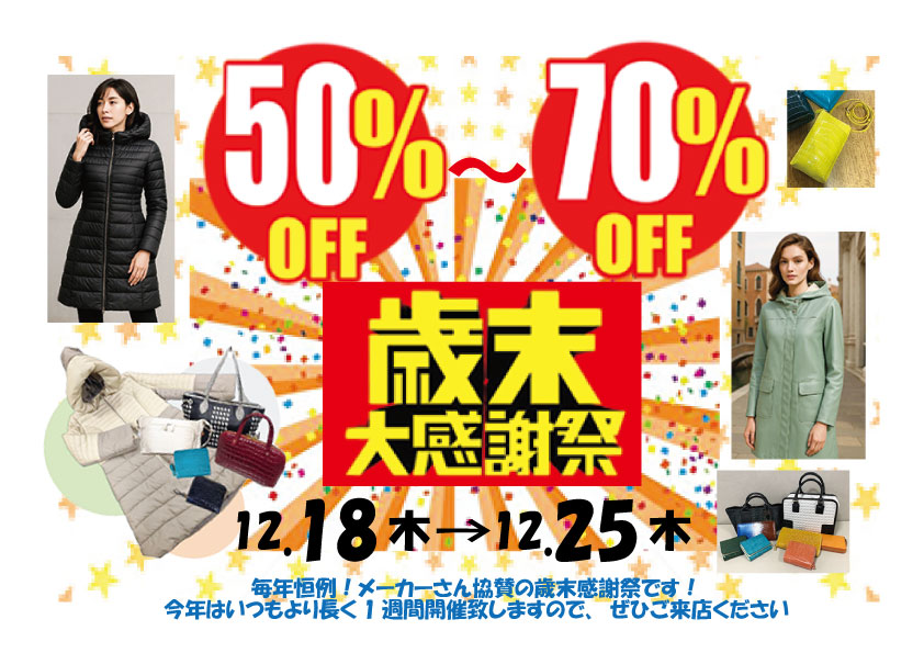 nowDMpage 2024.05.012025.12.20 ようこそ、いしだ へこのペーから、いしだの最新の店情報へ。 今週から始まる最新のご案内 今、開催中の「歳末大感謝祭」へは、以下をクリックして。 歳末大感謝祭 50%~70%OFFへようこそ 秋深まって…新作展 へは下のボタンをクリックして下さい 秋深まって…新作展2025 夏から秋への変わり目に・・・・・下をクリックしてください。 夏から秋へ・・・ 夏のバーゲンセールは、以下をクリック 夏のバーゲン半額セール開催中。連日の猛暑の中、お出かけも大変ですが、どうぞ暑さ対策を忘れずに。下のボタンをクリックすると、「夏バーゲンセール」のページに。全商品半額でのバーゲンセール。 2025夏SALE START いままでに開催された展示などは以下から ふわりと風を纏うような、軽やかでしなやかな着心地草木染ならではの繊細な色合い「しのぶ」の夏コレクションが揃いました! 夏のしのぶ展へどうぞ 今週の企画は、「しのぶ」とともに「特別顧客様&ネットをご覧のお客様限定」先行「夏のバーゲンセール30%~50%FF」のお知らせ。どちらも、上の「夏のしのぶ展・・・」をクリックしてお入りください。 夏バーゲン先行セール 最高に涼しい!上質の綿素材セレクション 上質な綿素材セレクション 決算 大感謝祭2025均一¥8800 & 靴30%OFF セール 決算大感謝祭へ 春から初夏に向けて。カットソーで気軽に、軽やかに。 2025春&夏のお洒落を 春から夏に向けての陽ざしへのこだわりを。帽子&UVカットジャケットで陽ざし対策をしましょう 春・帽子コレクションへ 先週までの展示かい。珍しいゴブラン織りバッグ。楽しいデザインで喜んで下さいました。また、下をクリックしてどのよなものか覗いてみて下さい。 Signareバッグコレクション 先週行われた展示会。下の春爛漫コレクションをクリックすると先週のご案内を。 春爛漫コレクション